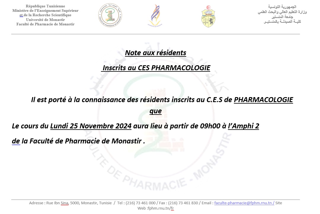 Note aux résidents Inscrits au CES PHARMACOLOGIE