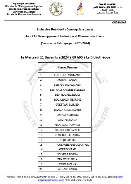 LA LISTE DES  RESIDENTS  INSCRITS AU CES DE PHARMACOTECHNIE  (Session  de rattrapage  2023-2024)