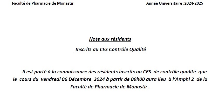 Note aux résidents Inscrits au CES Contrôle Qualité