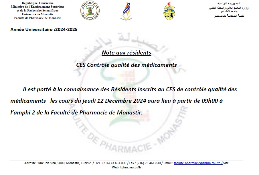 Note aux résidents CES Contrôle qualité des médicaments