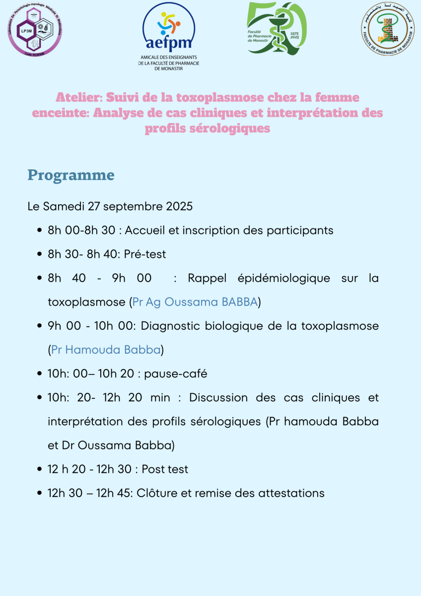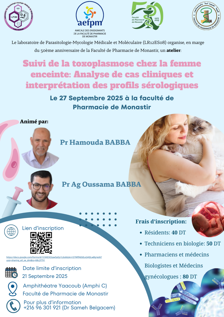 Le laboratoire de Parasitologie-Mycologie Médicale et Moléculaire (LR12ES08) organise, en marge du 50ème anniversaire de la Faculté de Pharmacie de Monastir, un atelier intitulé « Suivi de la toxoplasmose chez la femme enceinte : Analyse de cas cliniques et interprétation des profils sérologiques » qui sera animé par nos experts Pr Hamouda BABBA et Pr Ag Oussama BABBA.