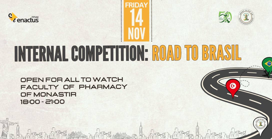 Nous avons l’honneur de vous inviter à la Compétition Interne Enactus FPHM, événement phare de notre année associative, qui se tiendra le vendredi 14 novembre à 18h Auditorium Faculté de Médecine Dentaire, FPHM Monastir
