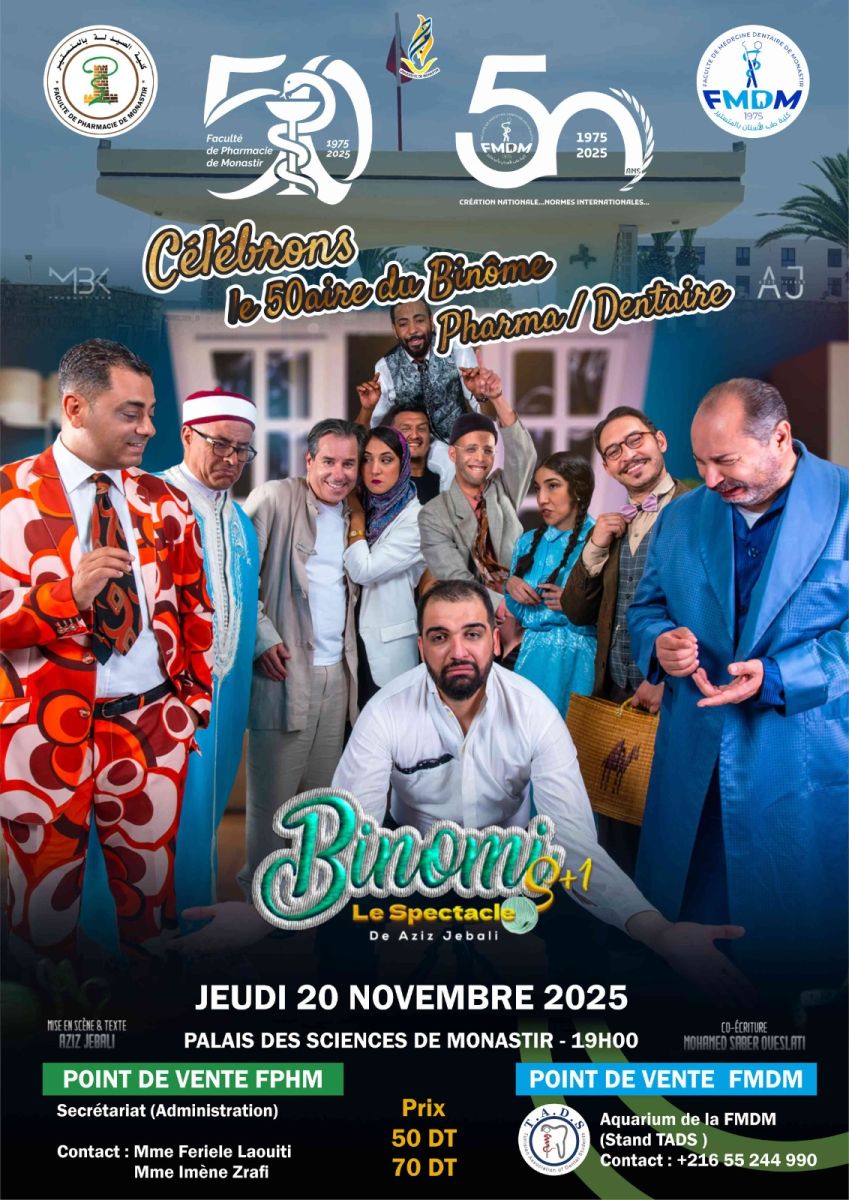 Dans le cadre des événements célébrant le 50ᵉ anniversaire de notre Faculté , nous avons le plaisir de vous annoncer la représentation de la pièce de théâtre « Binomi S+1 » de Aziz Jbali, qui aura lieu le mercredi 20 novembre 2025 à 19h au Palais des Sciences de Monastir.