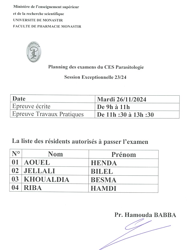 TELECHARGER LE PLANNING DES EXAMENS DU CES PARASITOLOGIE 2023-2024