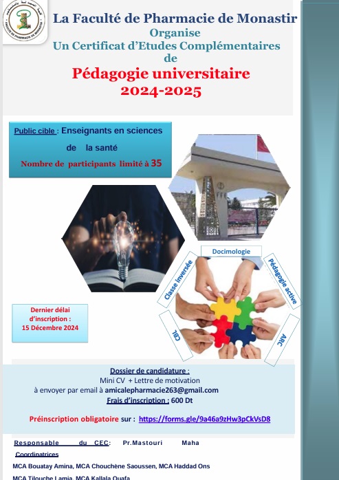La Faculté de Pharmacie de Monastir Organise « Un Certificat d’Etudes Complémentaires de Pédagogie universitaire 2024-2025 »