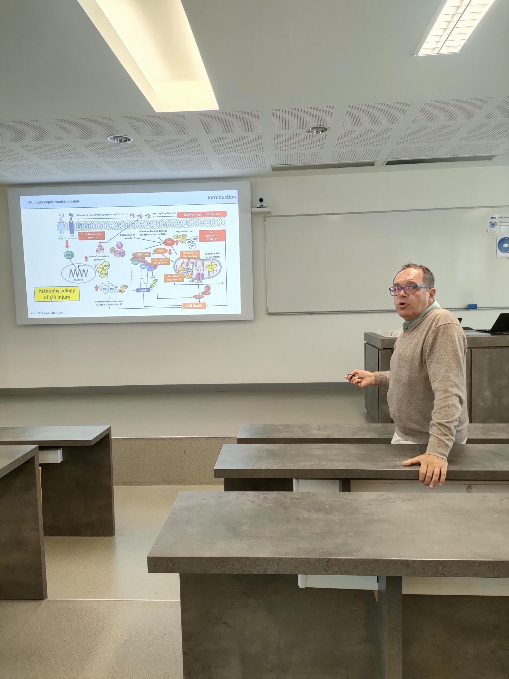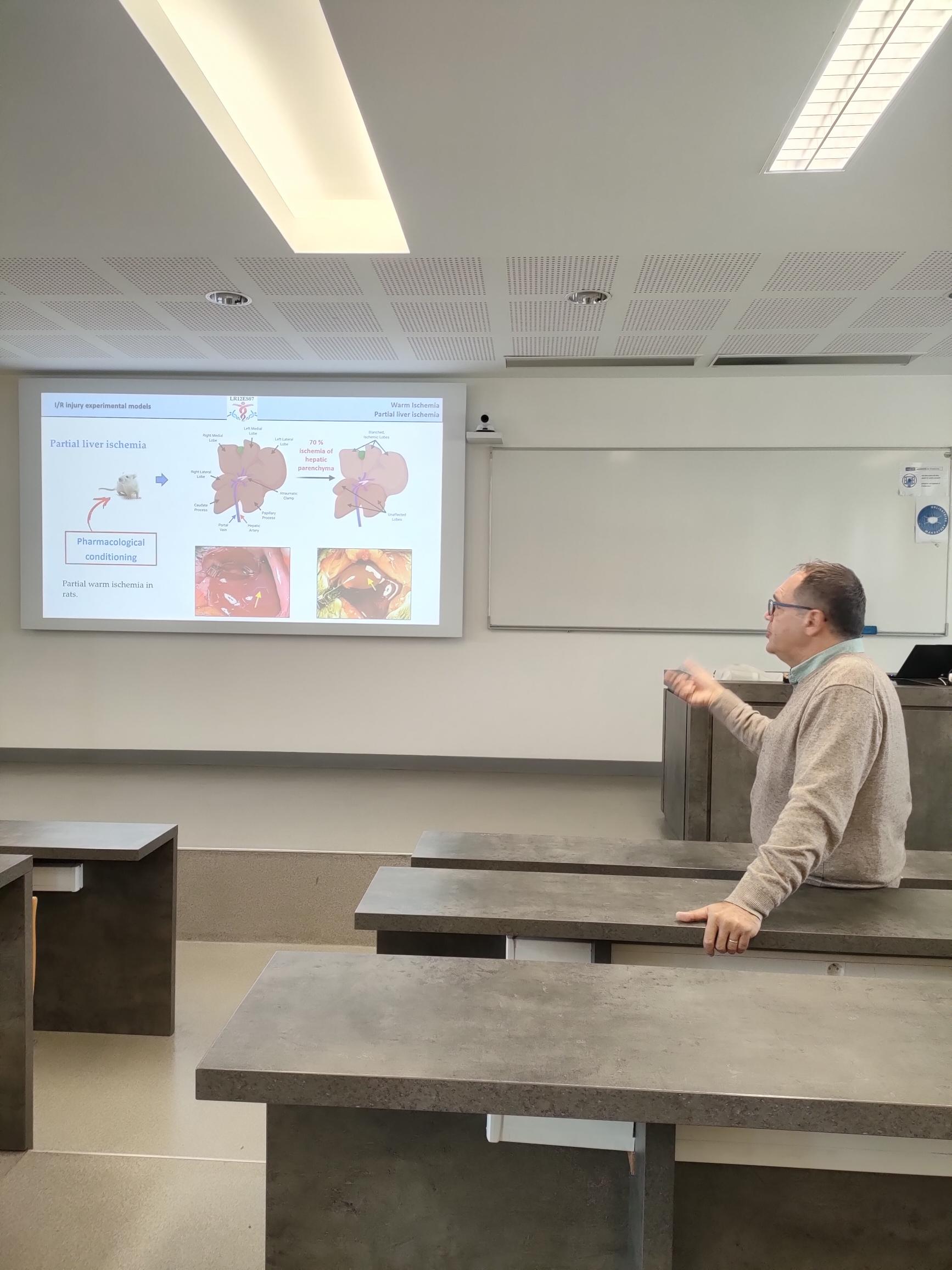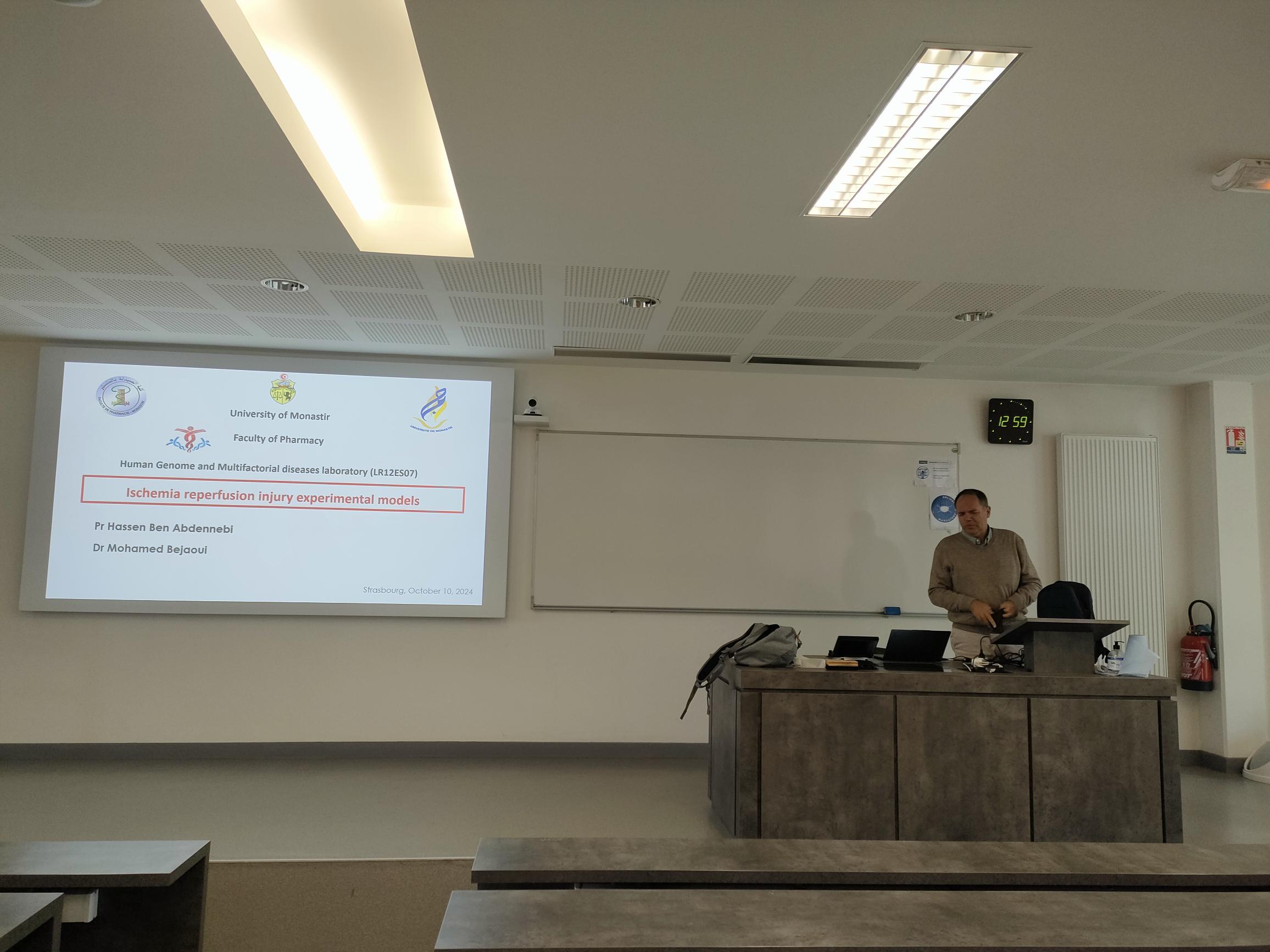 Dans le cadre du projet de recherche bilatérale PHC-Utique (CMCU 23G0801) codirigé par Dr Mohamed Bejaoui et Pr Nicolas Anton, le professeur Hassan Ben Abdennebi a présenté une conférence à la Faculté de Pharmacie de Strasbourg, au cours de laquelle il a introduit le laboratoire de recherche "Génome-Humain et Maladies Multifactorielles" et a détaillé leurs principaux axes de recherche, en particulier le modèle d'ischémie reperfusion. Cette présentation a suscité de nombreuses discussions et ouvert des possibilités de collaborations.